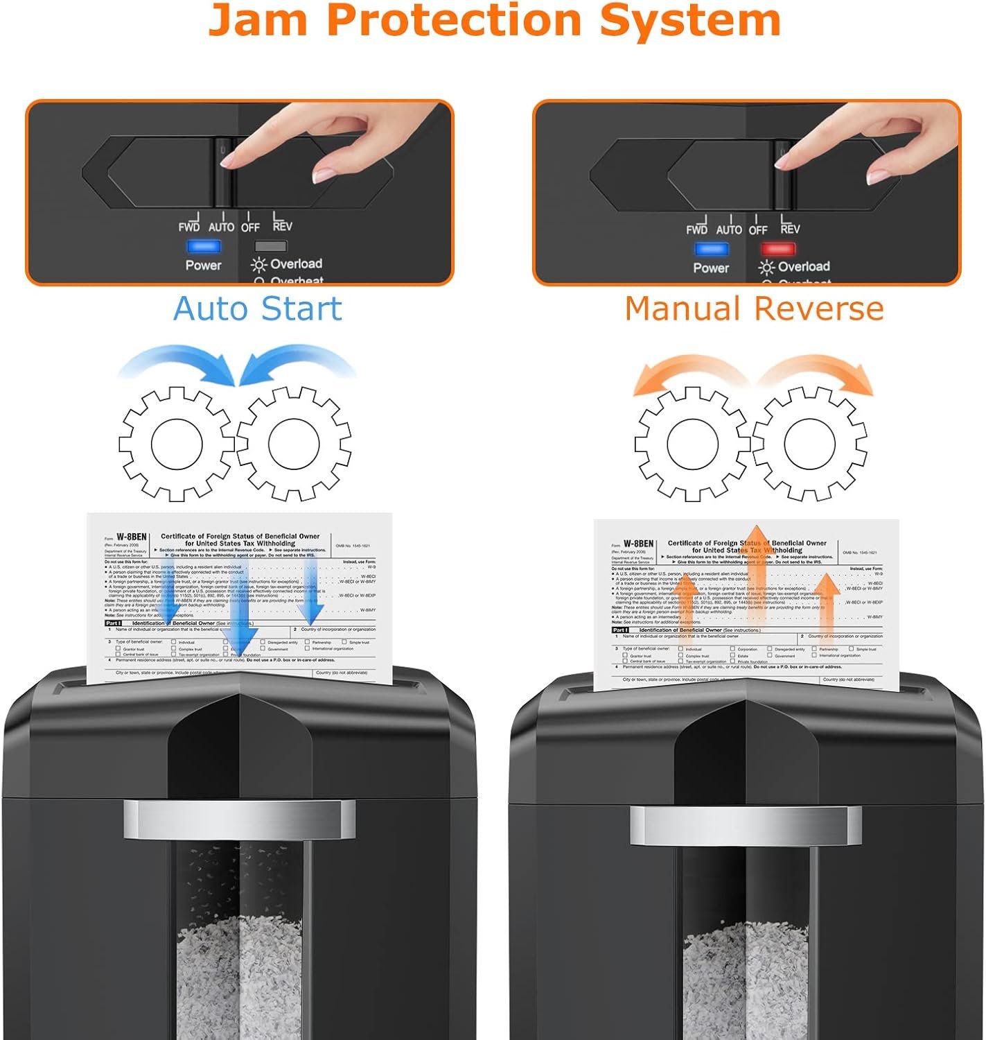 怐Jam-Proof & Easy Operation怑80 inches/minute shredding speed, efficient shredding speed makes your work more efficient. With Auto start and manual reverse function, effectively avoid paper jam, give you a smooth and efficient shredding experience. 3 buttons (auto/off-reverse-forward), very easy to use.