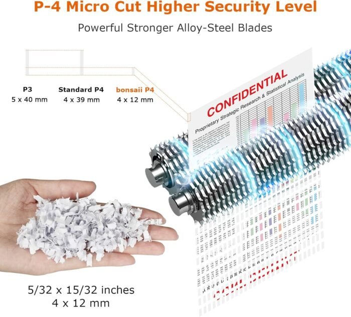 怐Higher security level than P-4怑 Heavy duty shredder for office uses High-quality nitrided steel cutters, can also effectively shred CD, credit card, mails, even with staples and clips into tiny particles of 13/64 x 15/32 inches (5 x 12mm). Commercial super micro-cut shredder provide maximum protection of your personal/commercial information.
