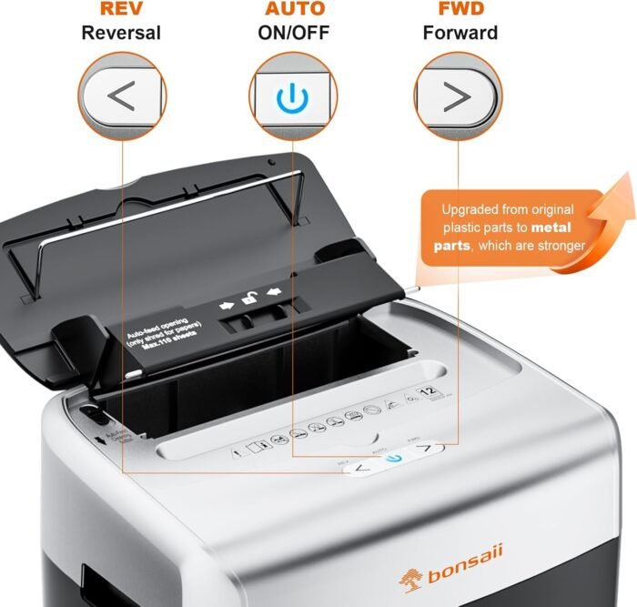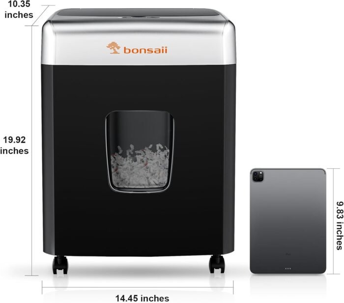 The Bonsaii 110-Sheet Autofeed Heavy Duty Shredder has been an absolute game-changer in my office. This shredder isn’t just powerful—it’s a marvel of convenience and simplicity that has revolutionized how we handle sensitive documents. From the moment I started using it, I noticed a significant improvement in workflow and time management.The autofeed feature is a standout, allowing me to load up to 110 sheets at once and walk away while it does the work. No more tedious manual feeding or standing by to insert pages one at a time. It chews through stacks of paper with impressive speed and doesn’t flinch at staples or paper clips, saving even more time. The cross-cut mechanism ensures that every piece of paper is thoroughly shredded, giving me peace of mind about confidential information.What truly makes this shredder awesome is how simple it is to use. The intuitive controls mean there’s no learning curve—it’s ready to go right out of the box. The large, easy-to-empty wastebasket is a thoughtful touch. It slides out smoothly without any mess, and the transparent window lets me see when it’s time to empty, preventing overflows.Despite its heavy-duty capabilities, the shredder operates quietly, which is a blessing in a busy office setting. I was pleasantly surprised by how unobtrusive it is, even when tackling larger shredding jobs. The sturdy build quality assures me it’s built to last, handling daily use without any signs of strain.If you’re looking for a powerful shredder that’s easy to operate and maintain, the Bonsaii 110-Sheet Autofeed Shredder is an excellent choice. It combines strength with user-friendly features that make document disposal effortless. It’s not just a machine; it’s a reliable office companion that enhances productivity and security.