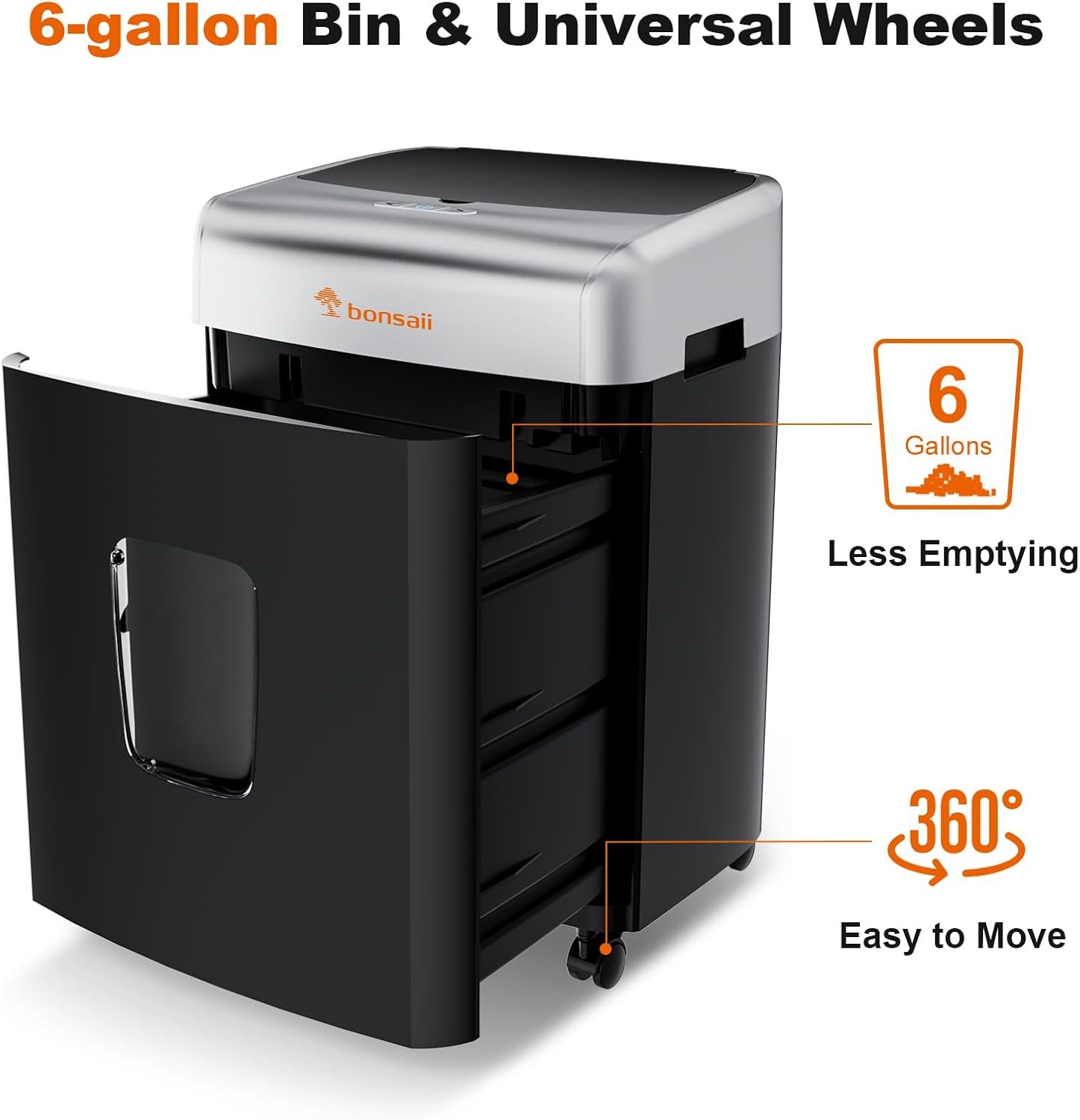 6-Gallon bin with transparent window & safety lockReduce the frequency of emptying paper shredder Basket Full Sensor