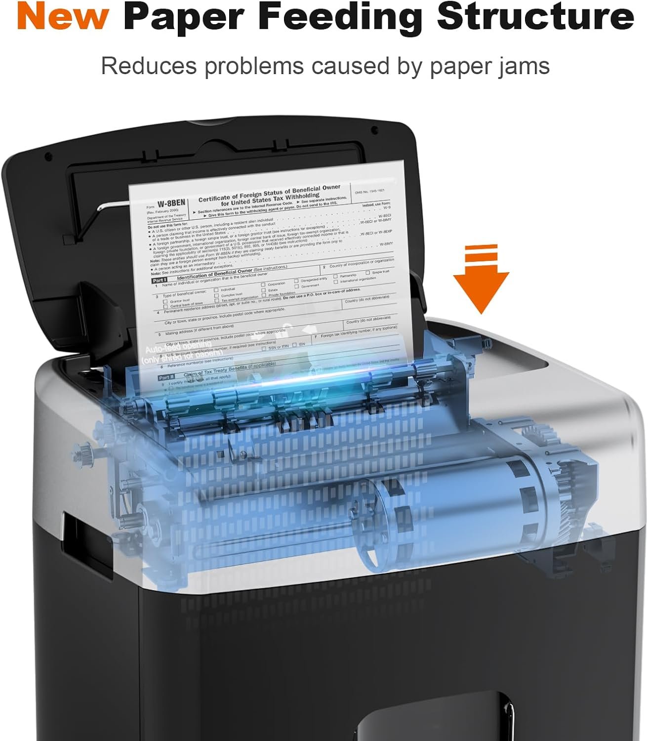 The paging wheel will auto reversed for 2-3s when shredding to reduce the frequency of paper jams