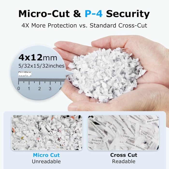 High Security P-4 Level: Micro-cut turns paper into tiny pieces measuring 5/32″ x 15/32″ (4 x 12 mm), greatly protecting your privacy.