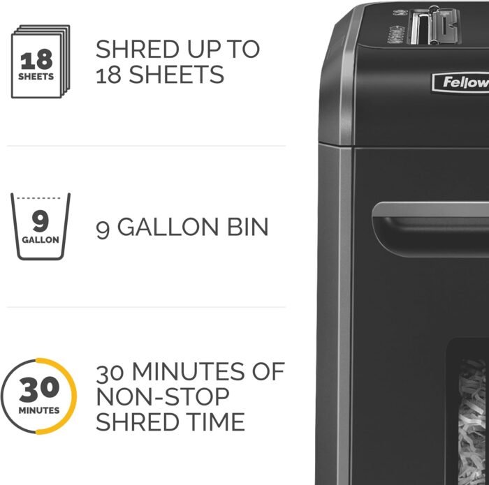 Fellowes’ 100% Jam-Proof Powershred 99Ci shreds up to 18 sheets per pass into 5/32 x 1-Ā½ā€ cross-cut particles, as well as staples, credit cards, paper clips, CDs/DVDs, and junk mail. Patented SafeSense Technology stops shredding when hands touch the paper opening. Perfect for personal and professional use, it can run for up to 30 minutes at a time and includes a 9-gallon pull-out waste bin complete with a LED bin-full indicator. Backed by a worry-free 2-year product and service warranty, plus a lifetime cutter warranty.