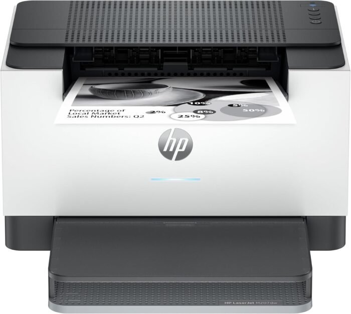 The HP LaserJet M207dw is a wireless printer that offers fast 2-sided laser printing, plus easy setup and reliable connectivity via dual-band Wi-Fi, Ethernet and USB 2.0. Get peace of mind with strong security and work more efficiently with time-saving features and mobile printing in the HP app. Plus, save energy with the HP LaserJet M207dwās Auto-On/Auto-Off technology. This duplex, monochrome printer creates pages with precision laser quality and is able to fit in any office space. The HP LaserJet M207dw is best for offices printing everyday black-and-white documents.