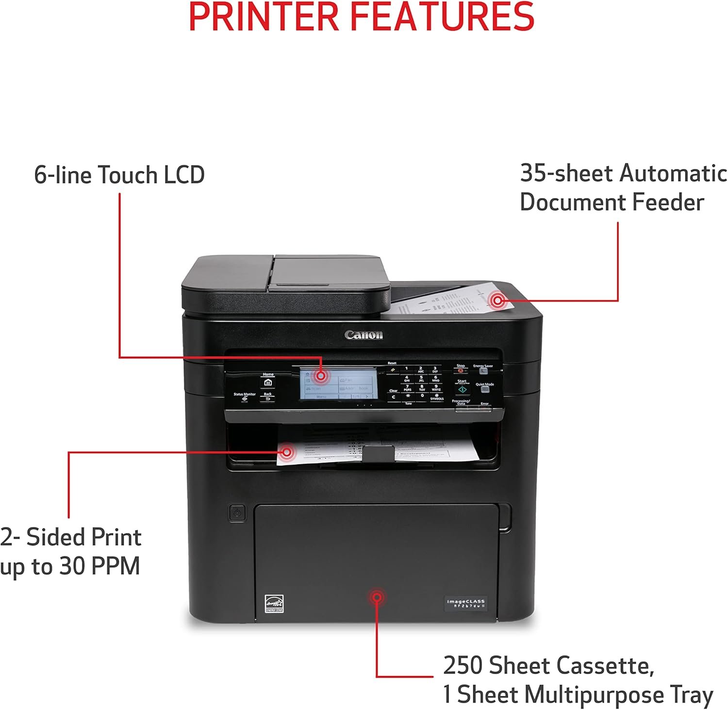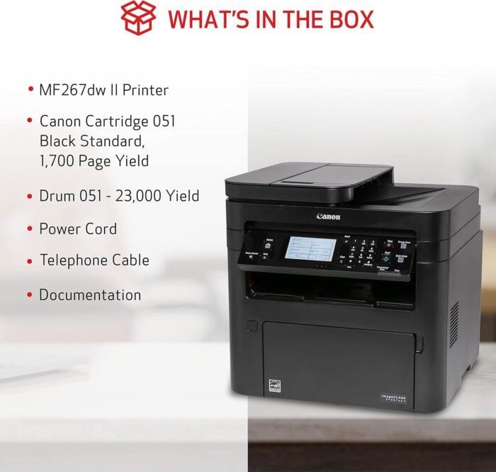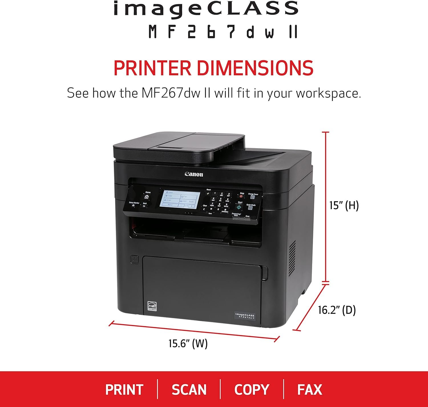 Designed for small and medium-size businesses, the imageCLASS MF267dw II model balances speedy performance and minimal maintenance. The MF267dw II is easy to set up and offers media versatility to print on a variety of media types and sizes, including envelopes, banners and more. The 6-line, adjustable touchscreen delivers an intuitive user experience. Produce crisp, bold documents with fast print speeds of up to 30 pages per minute, using high quality Canon Genuine Toner 051 / 051 H. Use Poster Artist Online to create monochrome professional-posters, banners and signage. The MF267dw II offers paper capacity of up to 250 sheets in the paper tray and 1-sheet multipurpose tray, and 35-sheet automatic document feeder. Easily connect and print through wirelessly from computers or mobile devices. Print using a variety of mobile apps, including the Canon PRINT Business app using your compatible mobile device. The MF267dw II comes with a 1-year limited warranty and is backed by Canon’s Service and Support network.