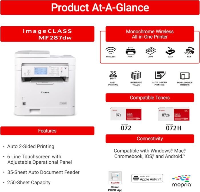 Received this printer 2 days ago. Exactly as expected. A non-nonsense. Simple. Laser black&white only printer. Its all I need and want. Replaces a similar Brother where I gave up after endless issues with the toner replacement watchdog.One problem with the Canon was entering WIFI password with lower and upper case text. Finding the lower case option not intuitive. Not mentioned on documentation. Manufacturers website was a tedious, circular search. CD did not work. Download of printer drivers thru google search worked. Printer works. Setup less than easy! Operates flawlessly so far.