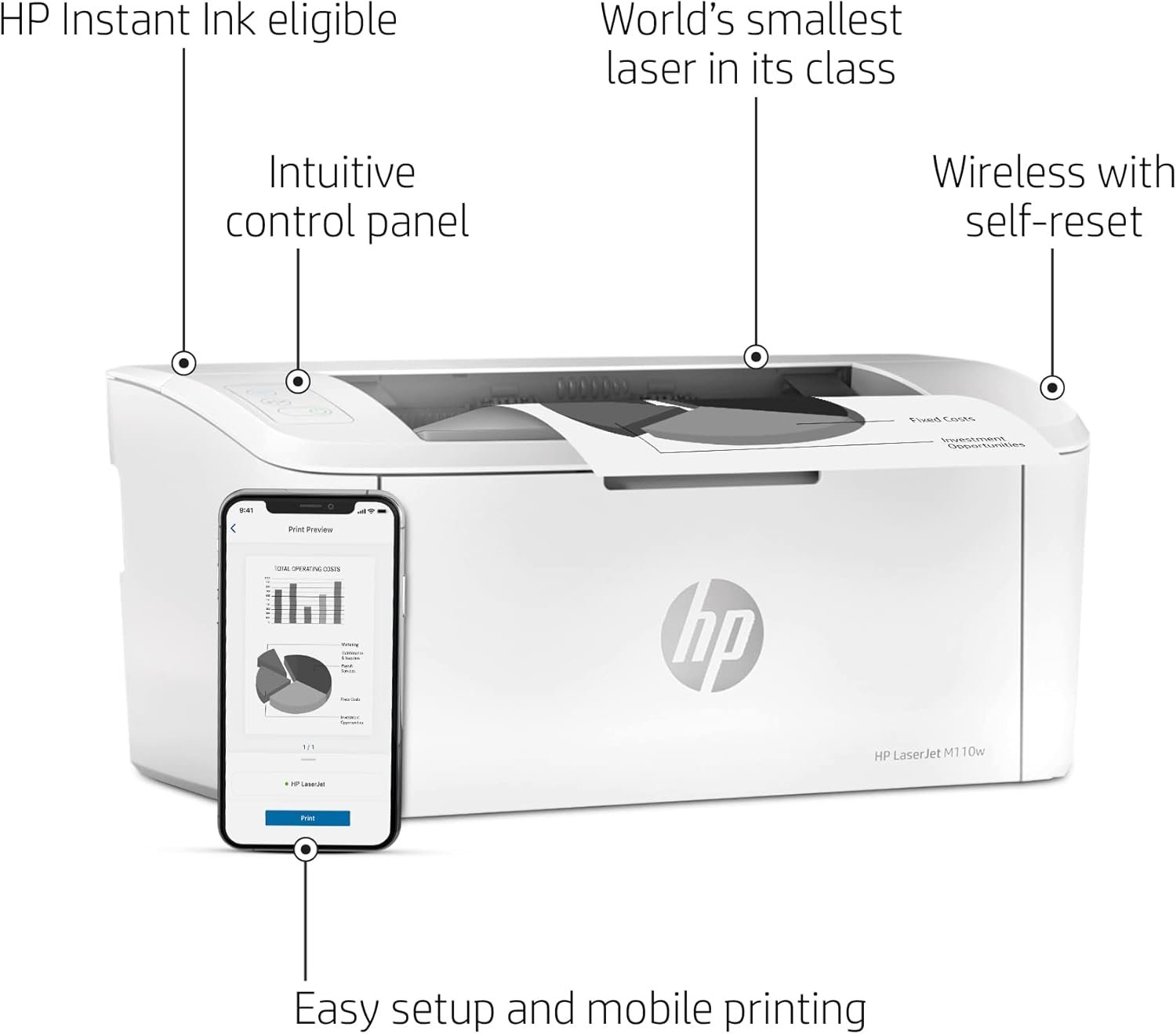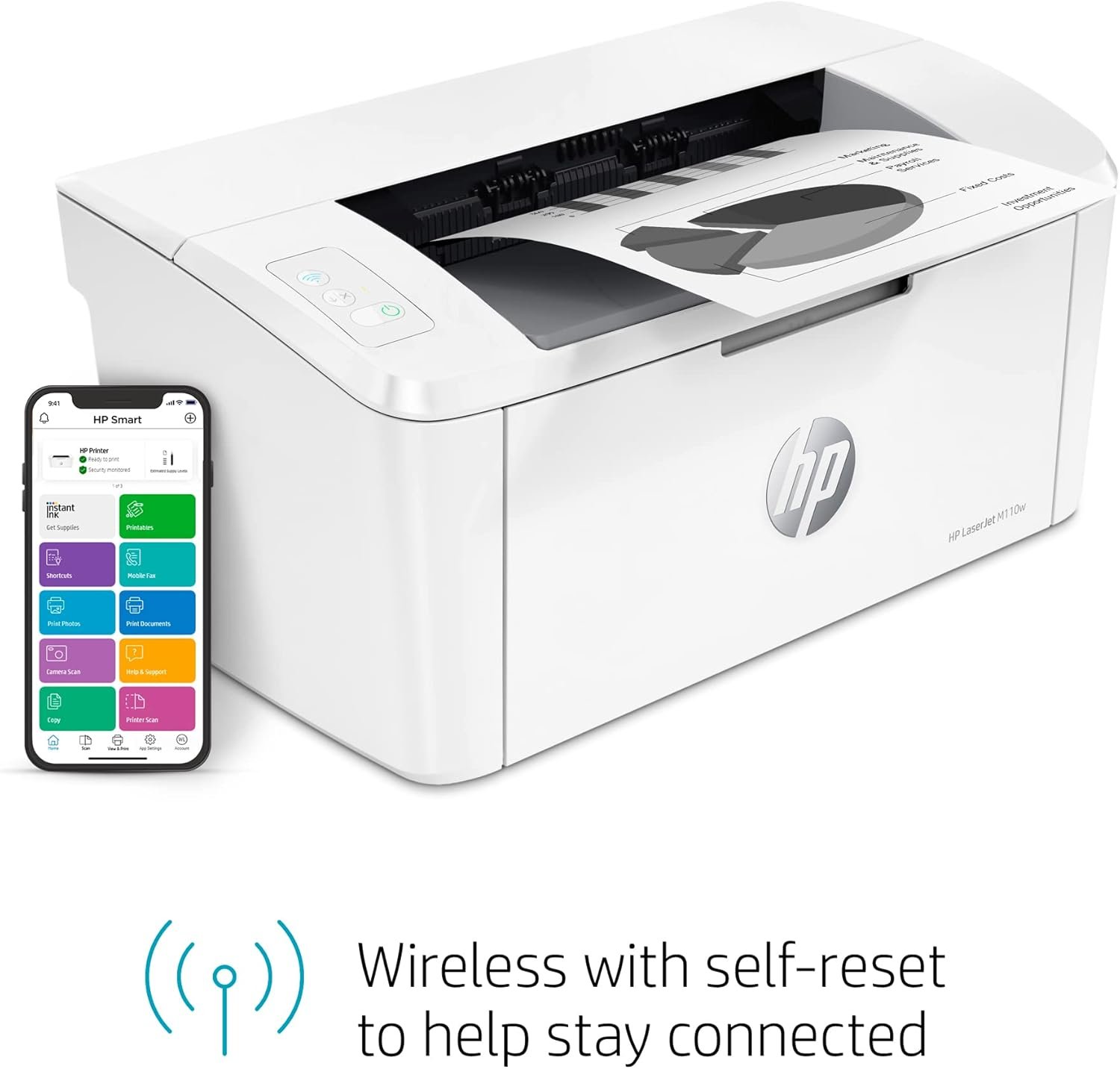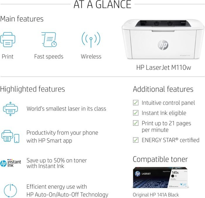 Experience the perfect blend of efficiency and convenience with the HP LaserJet M110w Wireless Monochrome Printer. Designed for compact spaces and fast-paced environments, this printer delivers high-quality black-and-white prints at lightning speed, making it an excellent choice for home offices, small businesses, and personal use. With its wireless capabilities, the M110w ensures seamless printing from your smartphone, tablet, or laptop using the HP Smart app, Apple AirPrint, or Mopria. The compact design fits effortlessly into tight spaces without compromising performance, offering a print speed of up to 21 pages per minute. The LaserJet M110w is engineered for reliability, producing crisp, clear text and sharp graphics on every page. Its energy-efficient technology minimizes power consumption without sacrificing performance, while the easy-to-use interface simplifies operation.