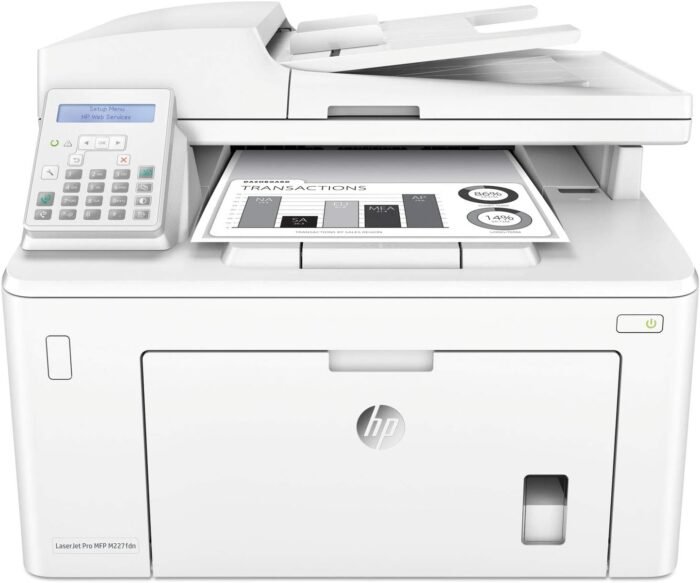 Main functions of the HP M227fdn all-in-one laser printer: monochrome print, scanner, copier, fax, AirPrint, double-sided printing, LCD display, 35-sheet auto document feeder, secure Ethernet connectivity, and more