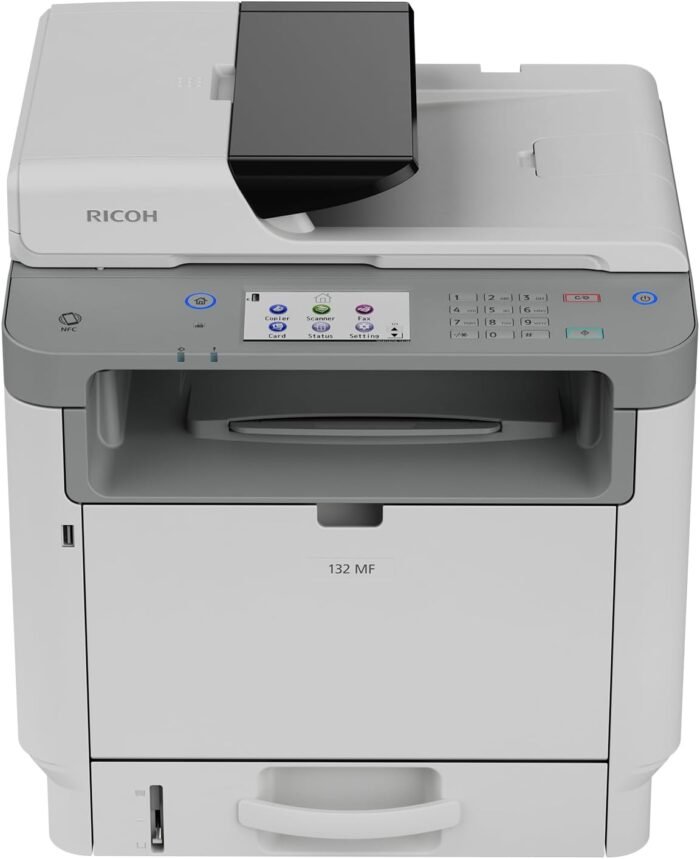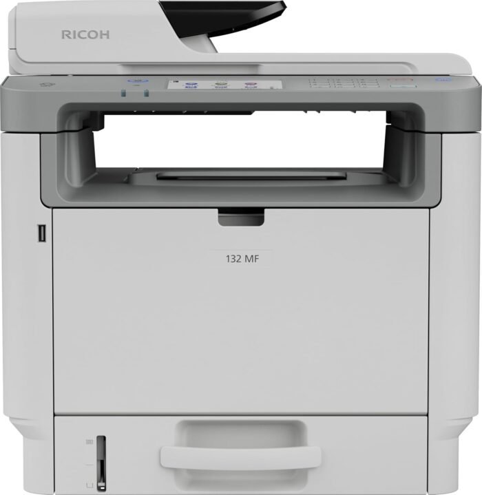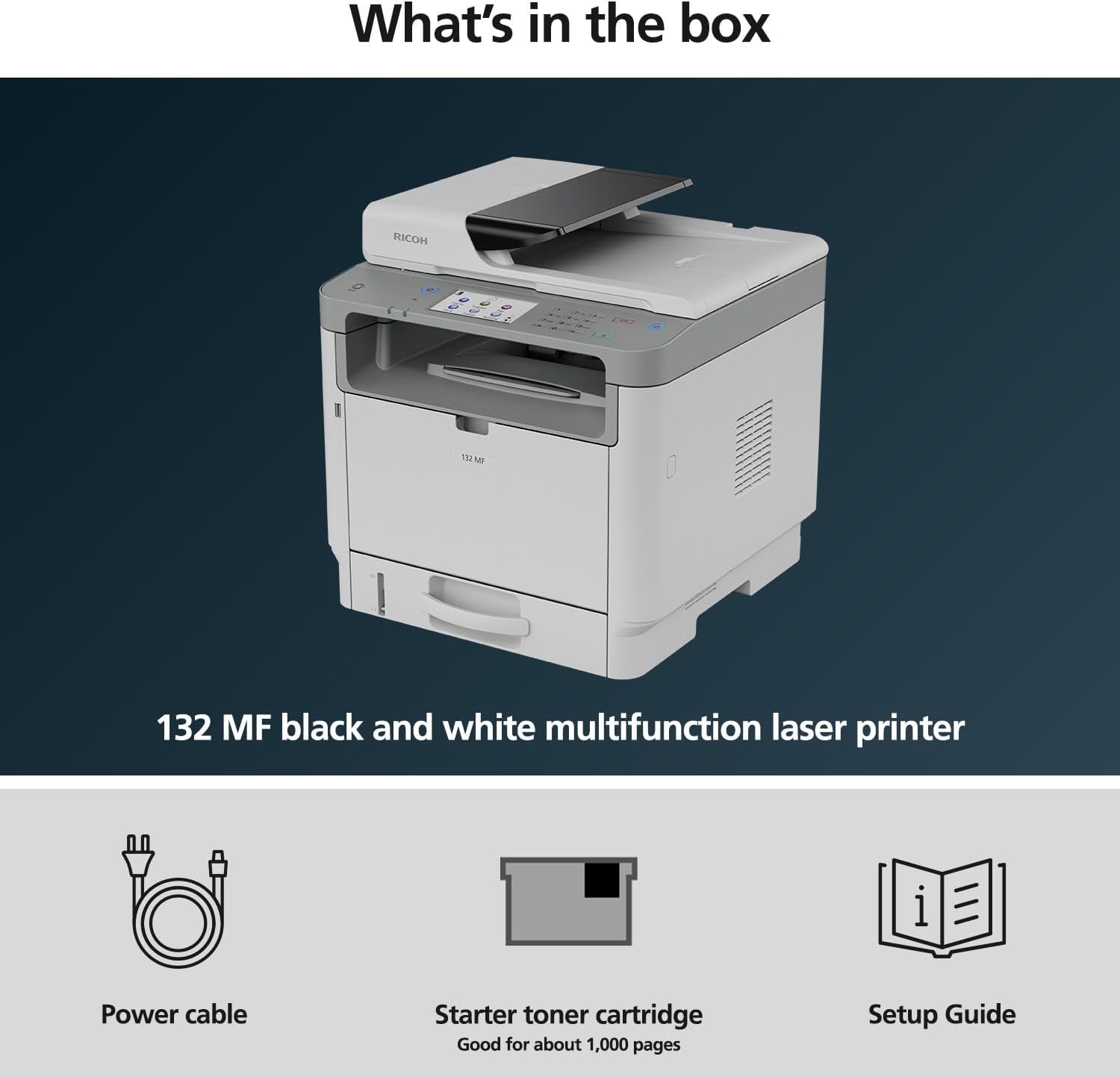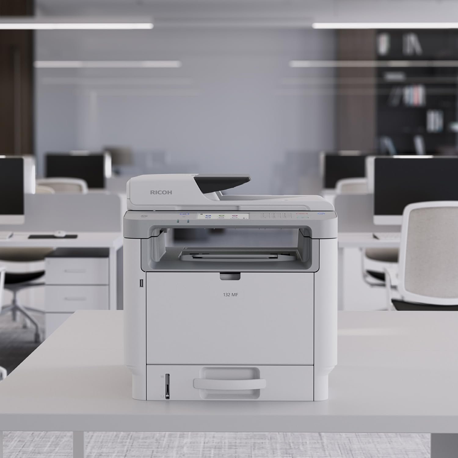 The RICOH 132 MF 4-in-1 multifunction, duplex printer can scan, fax, print and copy. Users can access the multifunction printer via the network and experience fast print speeds to deliver prints in monochrome.