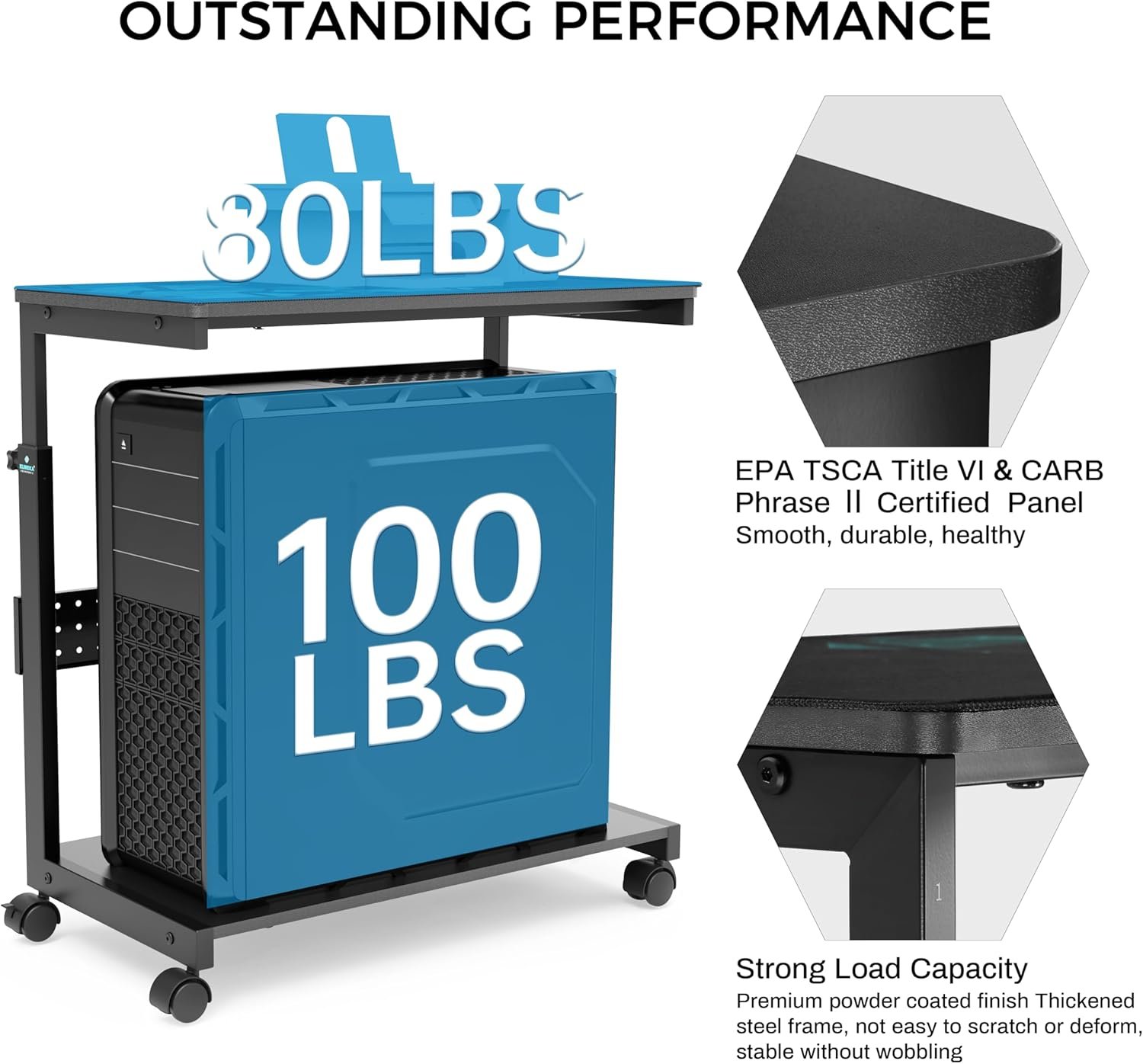 ” Certified desktop panel with premium anti-scratch finish. Thickened steel frame with powder-coated finish resists corrosion to ensure stability and durability, is not easy to scratch or deform, no wobbling. The bottom shelf max weight is up to 100 LBS, the top shelf is 80 LBS. NOTE: When moving, the cpu stand can only support up to 80 LBS.