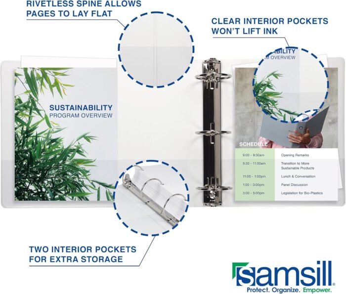 Professional Look: Designed to impress during presentations and look great on a shelf, our 3-ring binder features back-lid-mounted round binder rings for a rivetless spine