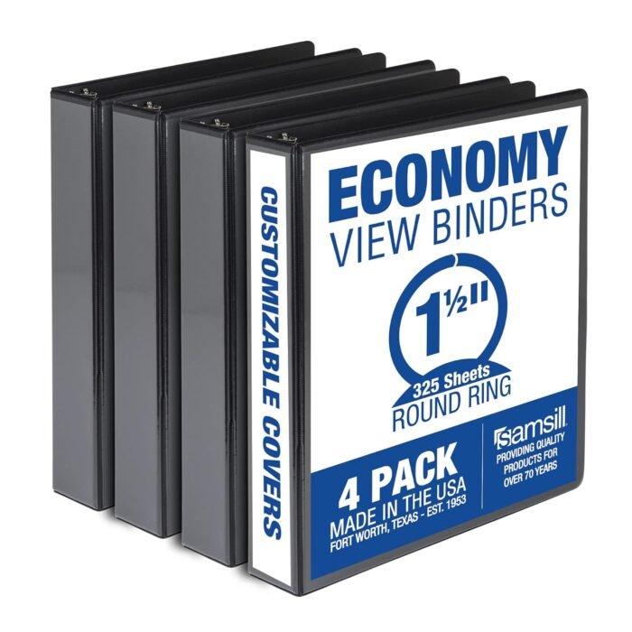 I recently purchased the Samsill Economy 3 Inch 3 Ring Binder set and I am extremely satisfied with this product. This set includes 4 black binders, each with a 3-inch round ring, customizable clear view cover, and is proudly made in the USA.The binders are durable and well-made, ideal for organizing and storing documents, reports, notes, and other important materials. The 3-inch size provides ample space for holding a large quantity of paper, making it perfect for school, work, or personal use.I love the customizable clear view cover feature, which allows me to easily insert a cover page or spine label for quick identification of the contents inside. The black color is classic and professional, suitable for any setting.Overall, I highly recommend the Samsill Economy 3 Inch 3 Ring Binder set to anyone in need of high-quality, versatile binders. The fact that they are made in the USA is an added bonus, showcasing the brand’s commitment to quality and craftsmanship. These binders have exceeded my expectations and have become an essential organizational tool for me.