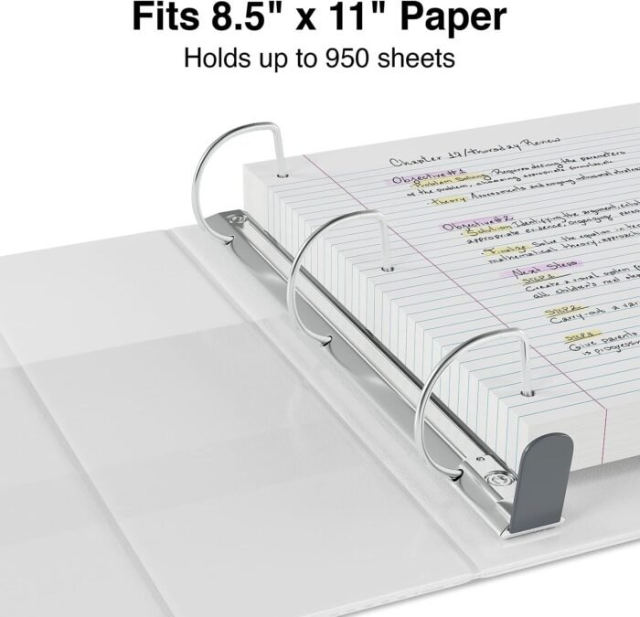 White view binder is an excellent choice for storing spreadsheets and other wide papers. Three D-rings keep pages secure. Holds up to 1,000 sheets. Durable covers are made of plastic with non-stick surface. Four interior pockets for added organization. Insert a custom spine label for easy identification.