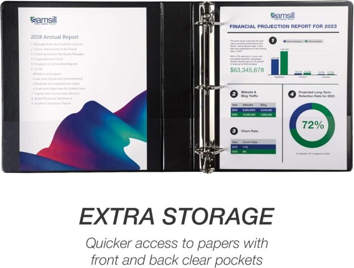 Samsill’s 3-ring binders make indispensable home, office, and school supplies. While many binders are available, our multipurpose business and school binder offers the economical paper storage and organizational value you’ve been searching for. This important document 1.5 Inch binder features a clear overlay along the front, back, and spine, allowing you to customize your presentations, projects, and more. Non-stick materials are used to make this product, which prevents ink transfer or lifting copy when materials are inserted into the cover or placed inside. Three binder rings with double boosters hold up to 125 8.5 by 11 inch letter-sized sheets with ease. The rings are mounted on the back lid, allowing pages to lay flat while preventing wear and tear on documents. Two clear interior pockets provide additional storage with enough space for notes, photos, business cards, or full-size pages. Get crafty with our ring binders and create a baseball card binder, portfolio binder, recipe binder, trading card binder, savings binder, etc. The possibilities are endless!
