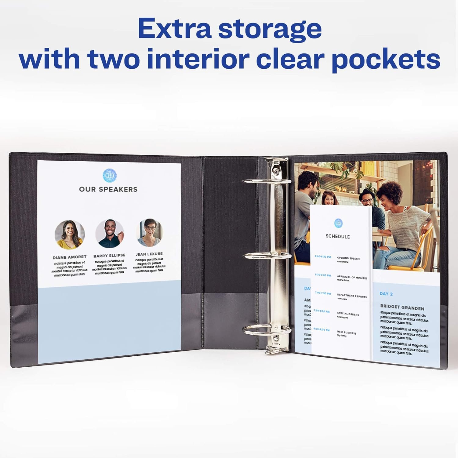 Sturdy 1 inch binder can easily hold up to 175 sheets of 3-hole punched papers, dividers and sheet protectors; enjoy extra storage with 2 interior clear pockets