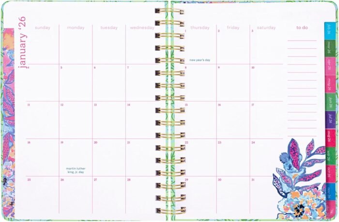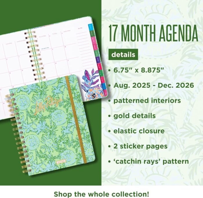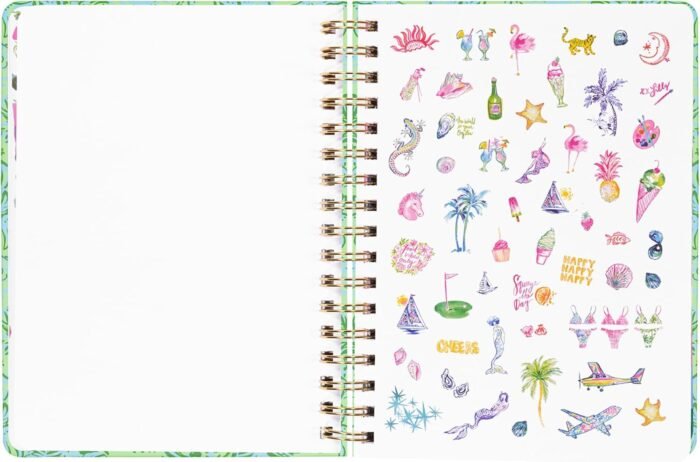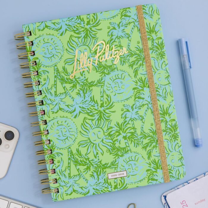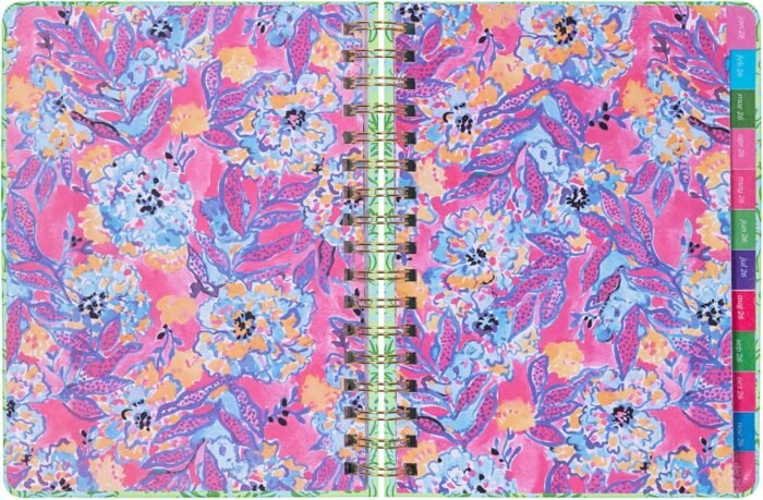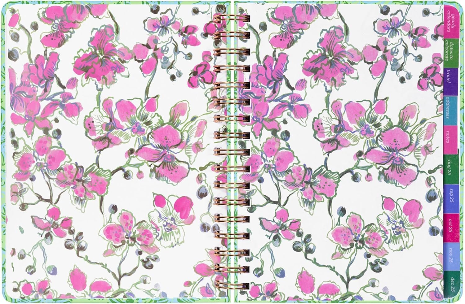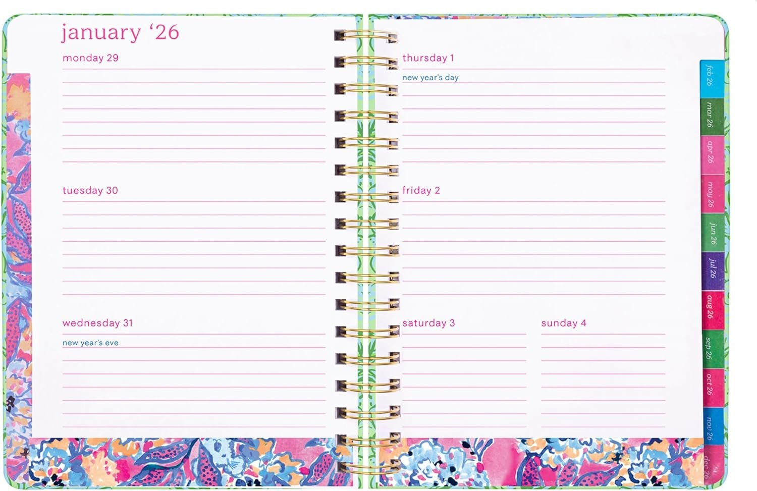 Beautiful Lilly Pulitzer planner. This planner starts with August 2025 and goes to December 2026. It has tabs for addresses and other important information inside. This planner comes with cute stickers that are classic Lilly Pulitzer design and colors- tropical/bright colors! This is a big planner- not something you could fit in your purse. I love the designs throughout the inside they all coordinate with the exterior print. Since the planner is large you have plenty of room to write on the calendar and daily pages. Excellent quality, very durable and would hold up nicely as a daily planner.