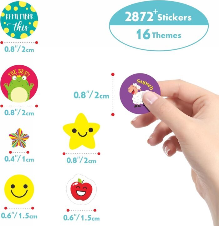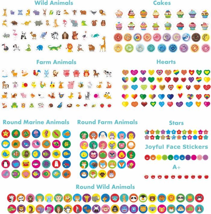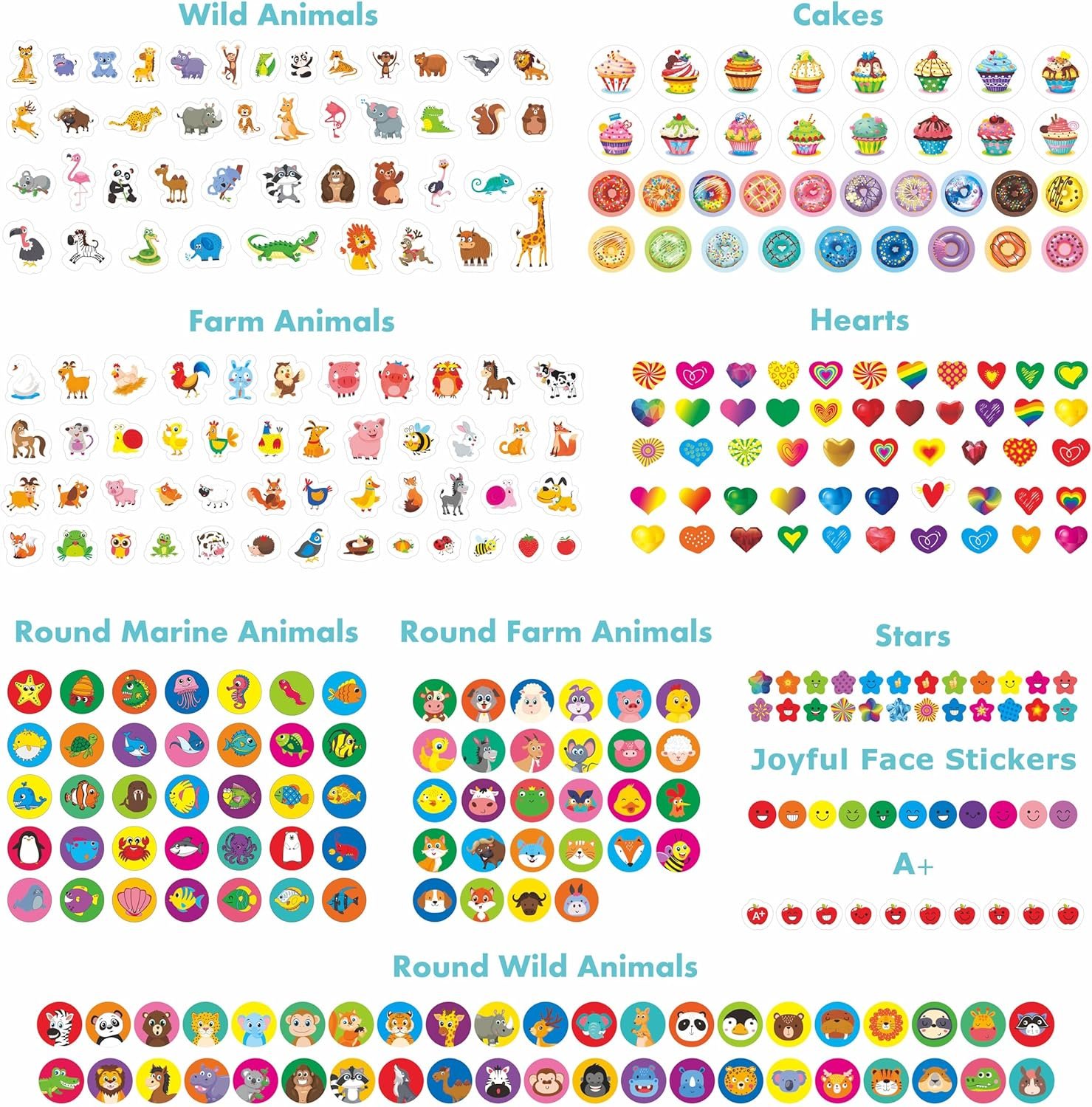 2872 cartoon incentive stickers are packaged on 64 easily distributed sheets. Various lovely animals, donuts, cupcakes, stars, hearts and happy face patterns contain all children’s desires. Each kid can get a satisfying reward! Printed with motivational words likeā€Good Jobā€ā€Excellentā€ā€Greatā€and more! Perfect for motivating children with a behavior chart, festival decoration, packaging or creating a craft project.