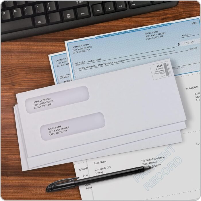 Double window envelopes show just the sender & receiver addresses; our business envelopes keep private info out of view; top window: 7/8″ x 3-1/2″; bottom: 7/8″ x 3-1/2″; envelope: 3-5/8″ x 8-11/16″