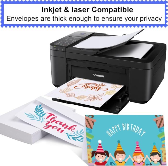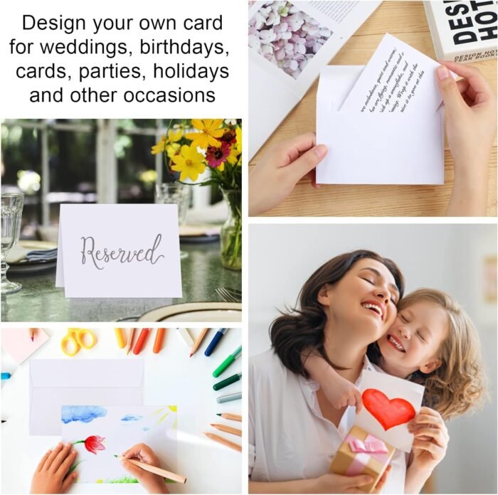 Print custom: These white Blank Card inside and out. These envelopes are suitable for printing. You can solve these problems with a laser or an inkjet printer. Blank cards and envelopes can be printed on digital and offset commercial printers. There is no need to worry about smudging or paper jamming, as these Blank cards and envelopes are compatible with most printer models.