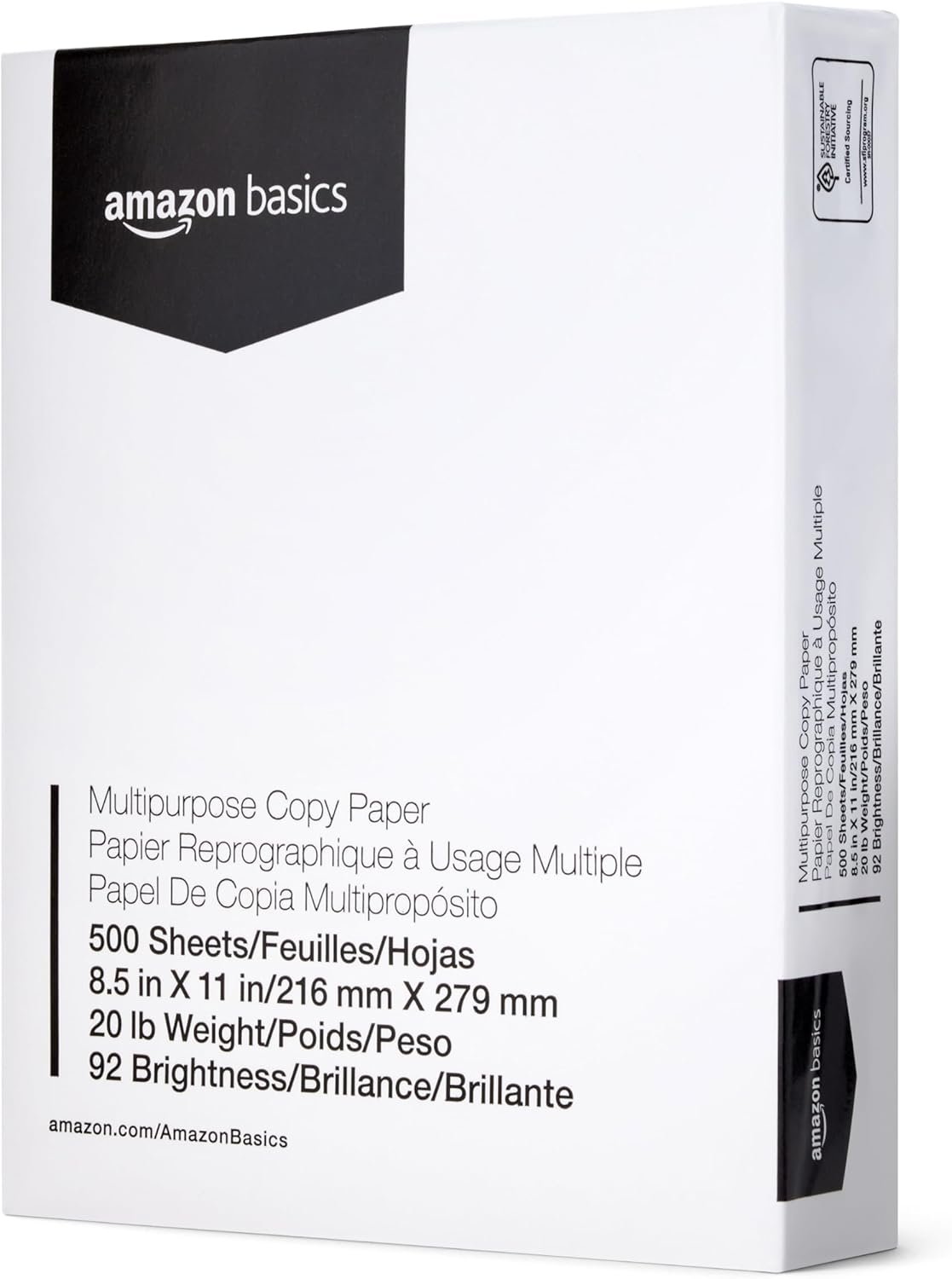 Amazon Basics Multipurpose Copy Printer Paper, 8.5 x 11 Inch 20Lb Paper – 8 Ream Case (4,000 Sheets), 92 GE Bright White