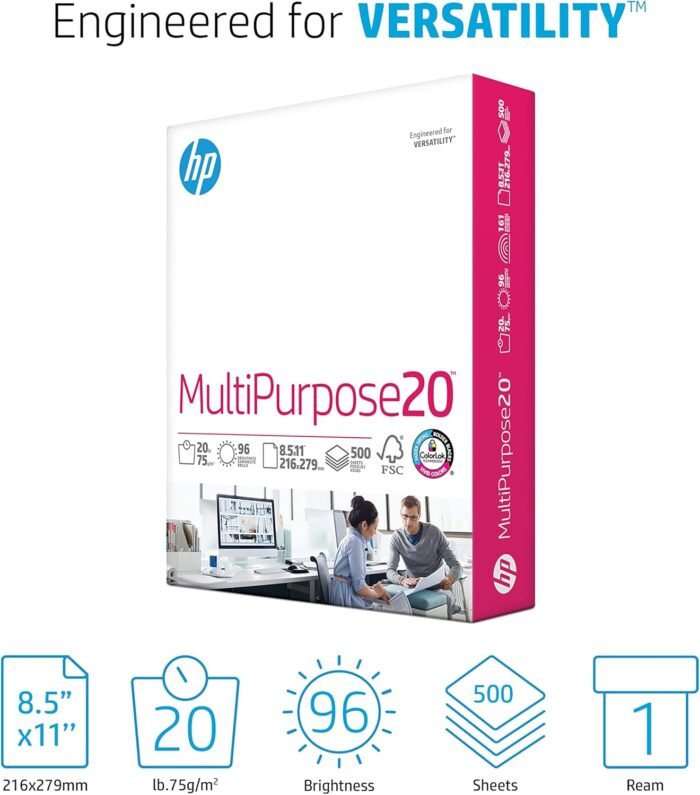 HP Papers is a premium line of uncoated printing paper optimized to provide superior print paper performance when used with HP hardware and supplies and in all other makes and models of printing and copying equipment. Launched in 1996, HP Papers are manufactured and marketed exclusively worldwide in over 75 countries by Sylvamo, a globally recognized leader in paper products, under license from the Hewlett-Packard Company. With a diverse range of products designed to support a wide range of print applications, from everyday copies to full color presentations, you can be assured of consistent, high quality print performance every time. HP MultiPurpose20 Paper is a 20 lb, super smooth economical and multipurpose paper for everyday printing and copying. HP MultiPupose20 is whiter and brighter than most standard copy paper, producing documents with higher contrast and extra sharpness. Even routine documents look great, with brighter colors and crisp, sharp text. HP MultiPurpose20 printer paper is available in 8.5 x 11 letter size paper, 11 x 17 ledger size paper, and 8.5 x 14 legal size paper.