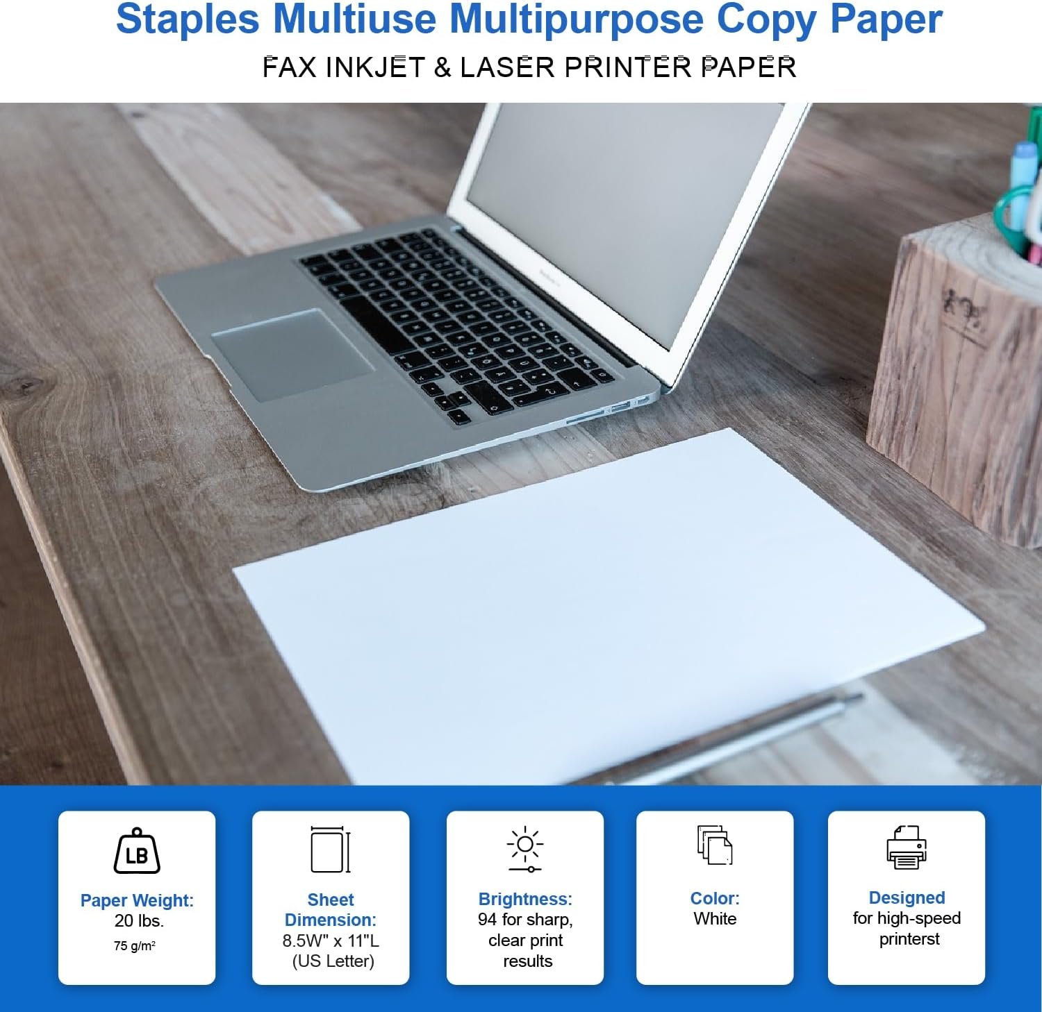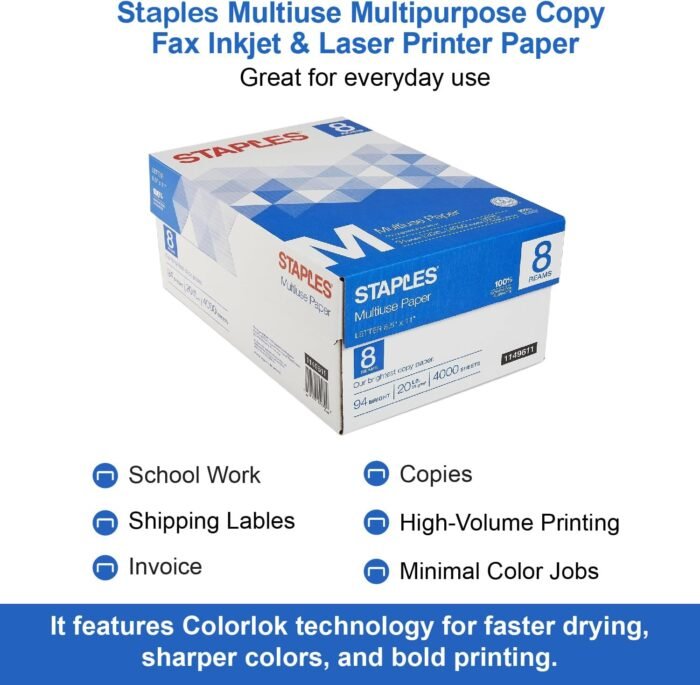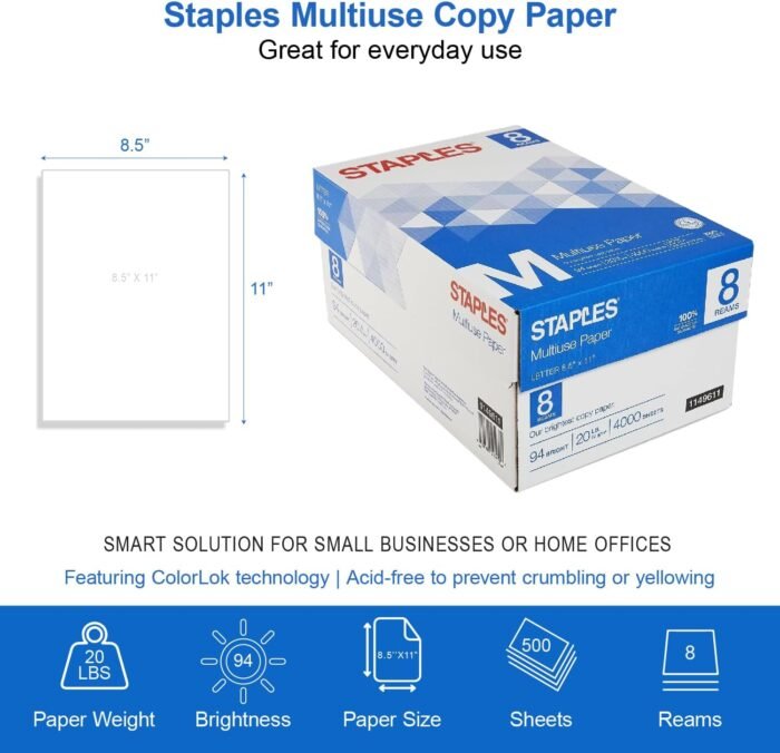 Staples Multiuse 8.5″ x 11″ Multipurpose Paper, 20 lbs., 94 Brightness, 500/Ream, 8 Reams/Carton (26860-CC)