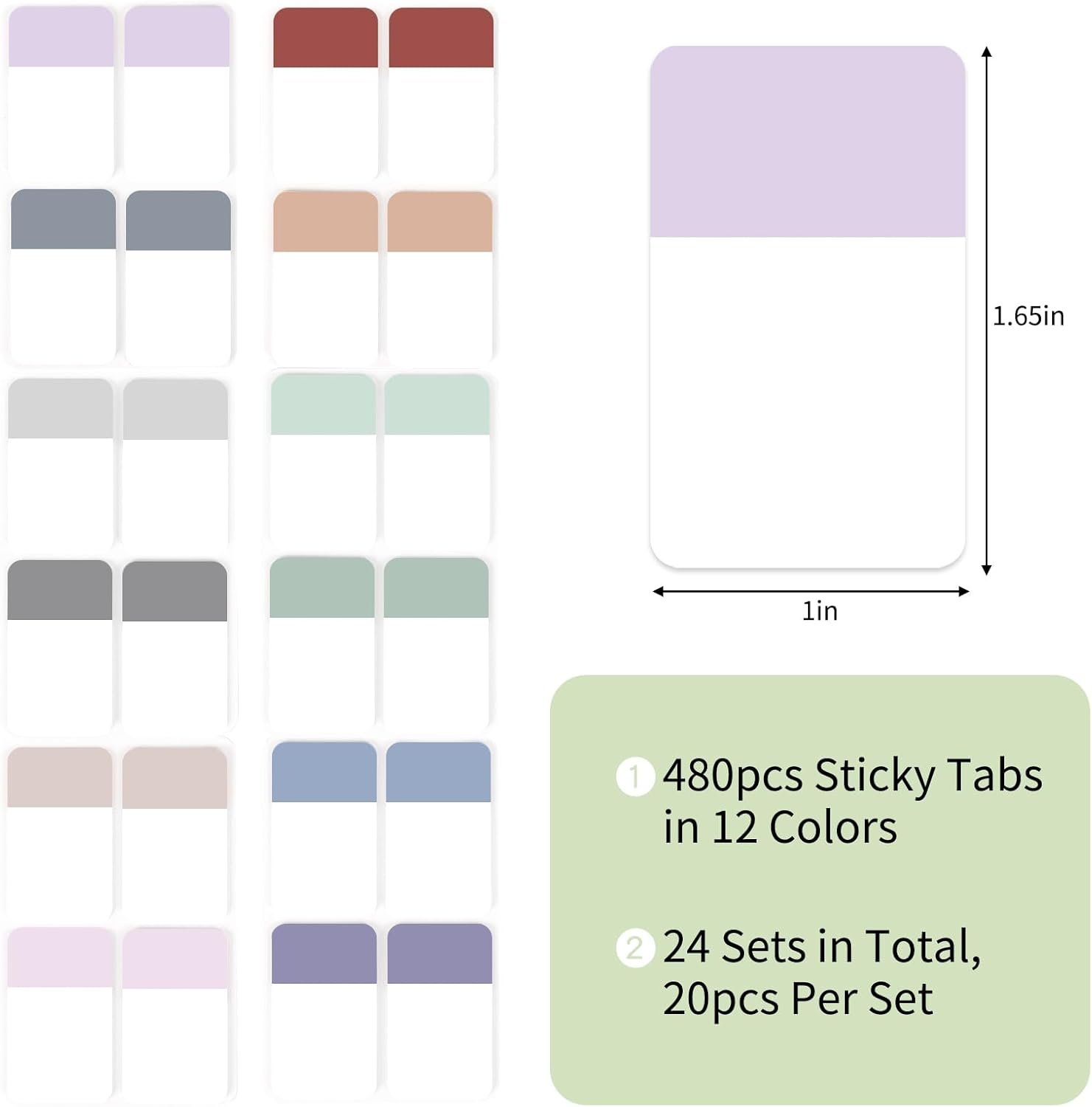 Super-Value Pack & Portable Size: Package contains 480pcs sticky tabs, 24 sets in total, 20pcs per set. The size of each tab is 1.65×1 Inch. Available in 12 different pastel colors, colors are as shown in the figure.