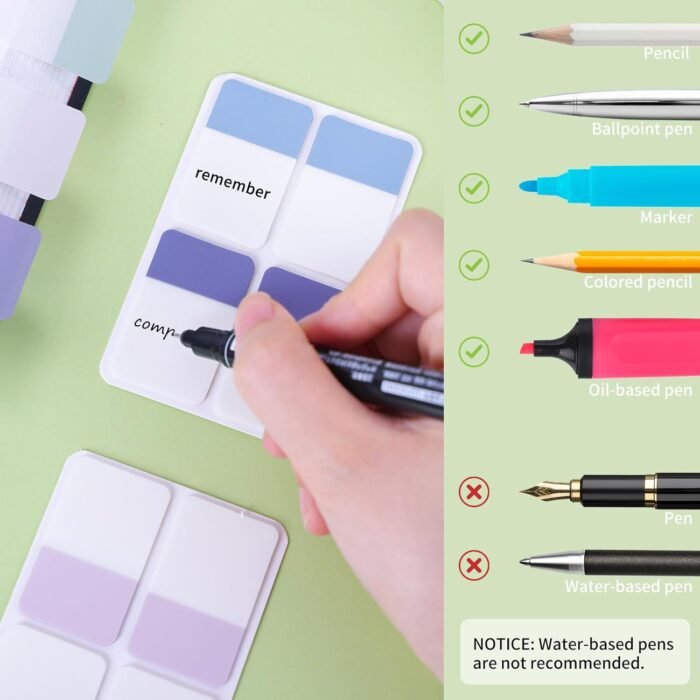 Removable and Writable: With adhesive, the sticky tab is not easy to fall off, and does not leave any residue, can be reused. Half of the tabs with self-adhesive making it convenient to stick and mark. The self-adhesive part is transparent, you can write on the colored parts.