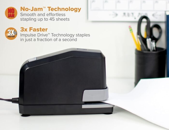 3X FASTER STAPLING SPEED – Bostitch Impulse Drive Technology allows users to immediately remove stacks on paper after the stapler pierces the sheets. No need to wait for the machine to retract like with other electric staplers.