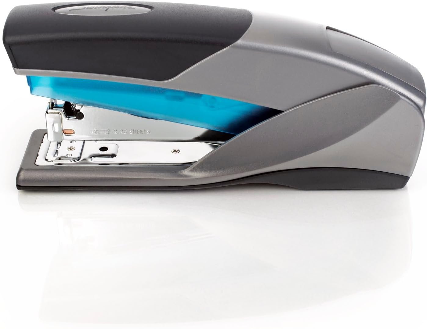 With durable gray-and-blue plastic housing to protect the metal stapling mechanism, the Optima 25 stapler is built to give you long-lasting, reliable stapling. This stapler holds a full strip of 210 staples. Sleek stapler is designed for desktop use. A helpful low-staple indicator lets you know when it’s time for a refill. Optima fastens up to 25 sheets of paper and works best with Swingline Optima or S.F. 3 staples, with standard 1/4ā length legs. The Optima 25 design requires less force than traditional staplers, so you can save your muscle for something that matters. Soft, ergonomic grip ensures comfortable stapling. Quiet stapler is designed to be less disruptive in offices and classrooms. Tasteful blue and gray coloring. Swingline stands behind this high quality stapler with a limited lifetime warranty.