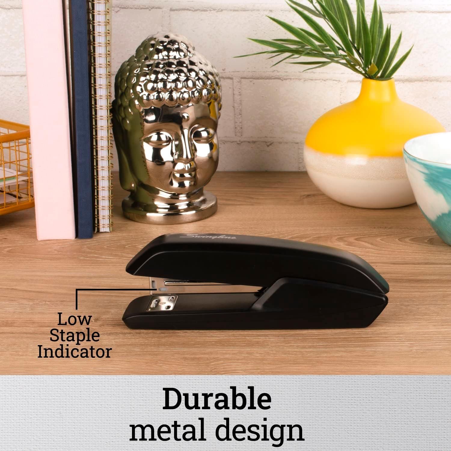 DESIGNED FOR DESKTOP ā Ideal for use on a desk or any flat surface. This stapler holds a full strip of 210 staples. A helpful low-staple indicator lets you know when it’s time for a refill.