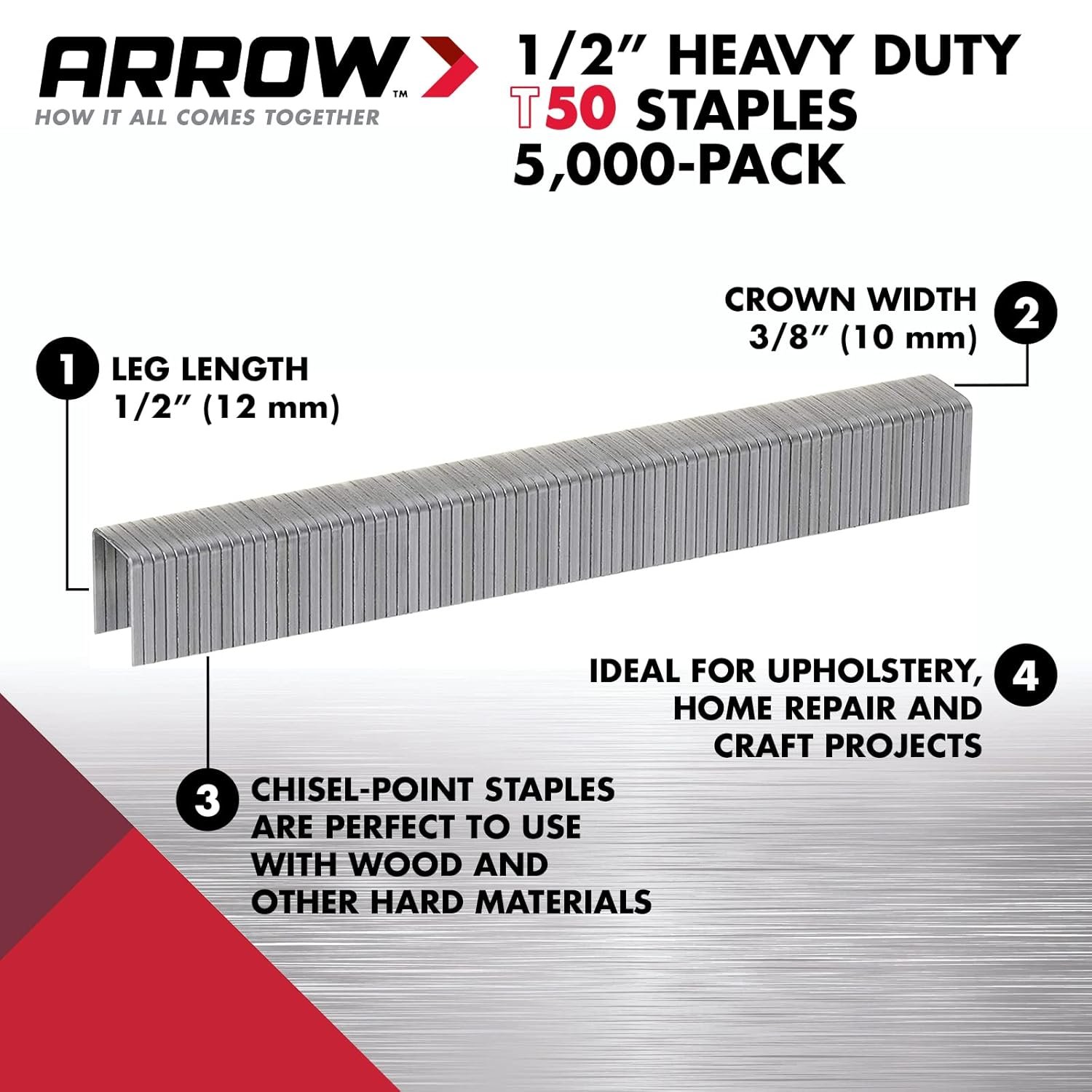 I recently started using Arrow 508 Heavy Duty T50 Staples for various projects, and they have proven to be an essential addition to my toolkit. Hereās why I highly recommend these staples:Arrow 508 T50 staples are designed for heavy-duty applications, and they deliver excellent performance every time. The 1/2-inch leg length and 3/8-inch crown provide a secure hold, making them perfect for a variety of tasks, from upholstery and construction to furniture assembly and crafts. These staples are built to handle demanding jobs without bending or breaking, ensuring a dependable hold that lasts.One of the standout features of these staples is their versatility. Iāve used them for upholstery projects, and they have secured fabric tightly without damaging it. For construction and furniture projects, they provide a strong, consistent hold on different materials, including wood and fabric. Theyāre also perfect for crafting, allowing me to create durable and professional-quality pieces.Made from high-quality steel, these staples are designed to withstand heavy use. The robust construction ensures they penetrate materials cleanly and hold securely, making them a reliable choice for both professional and DIY projects. The sharp points make them easy to drive into various materials, reducing effort and enhancing efficiency.The pack of 1250 staples ensures I have an ample supply for multiple projects. This convenient pack size means I donāt have to frequently restock, saving time and effort. The staples come neatly packaged, making them easy to store and access as needed.These staples are specifically designed to be compatible with T50 staplers, which are widely used and trusted by professionals and DIY enthusiasts alike. The perfect fit ensures smooth operation and reduces the risk of jams, making the stapling process seamless and efficient.Considering the quality and quantity of the staples, they offer excellent value for money. Theyāre an affordable yet high-performance solution for anyone looking to tackle a variety of projects with confidence and ease.In summary, Arrow 508 Heavy Duty T50 Staples are a fantastic choice for anyone in need of reliable, versatile, and high-quality staples. Their sturdy performance, versatility, high-quality materials, convenient pack size, and compatibility with T50 staplers make them an indispensable tool for both professional and home use. I highly recommend these staples for all your heavy-duty fastening needs.