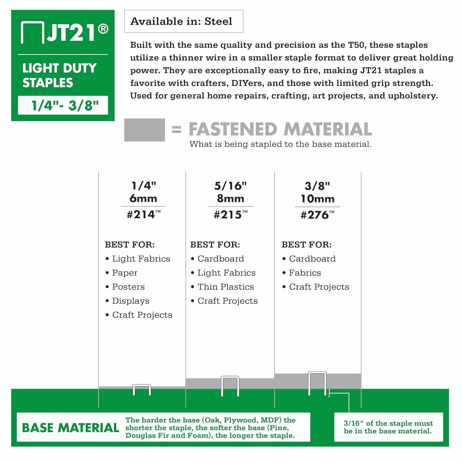READY FOR ACTION: These staples are used for all stapling applications that use a thin wire: from general repairs, to crafts, upholstery, and fabric work, the JT21 has the same quality and precision as the T50 heavy duty staples, for great holding power
