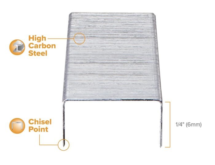Standard staples manufactured from superior quality high carbon steel wire, easy stapling performance. Sharp chisel point ensures less jamming. These staples also have 15% fewer misforms than the competition. 1/4″ leg length, 210 staples per strip, 5000 staples per box.