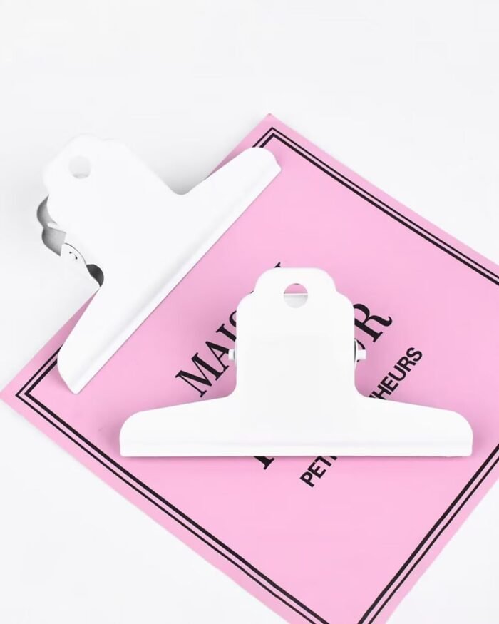 These are very large and strong metal binder clips. I love the pink color. I have them in the four-inch-wide size, and they hold papers quite securely. They can hold almost a one-inch stack of papers. The spring mechanism is strong, and you do need typical adult hand strength to open them fully.