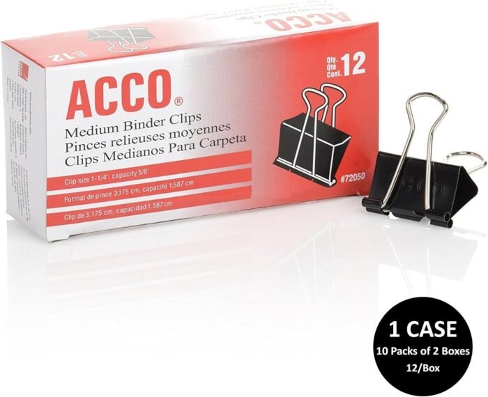 Tuck your important projects into these tenacious binder clips. Clips grip paper firmly and eliminate slippage. Theyāre an excellent choice for organizing papers and cords, hanging posters, and more. These 1-1/4ā wide clips can hold up to 5/8″ stacks of paper. Theyāre made of tempered steel for extra strength and durability ā theyāre able to easily clamp, compress and grip paper without tearing. Sleek, black steel clips with silver arms are built to blend into any office environment. Theyāre easy to use in a pinch ā literally. They release with a pinch of the arms. Binder clips can be a great solution for pesky storage problems. Their prongs maintain flexibility for unlimited reuse, and their tempered steel construction ensures long-term durability. Convenient case gives you 12 clips per box, and 20 boxes per case, to help you organize your desk and straighten your space.