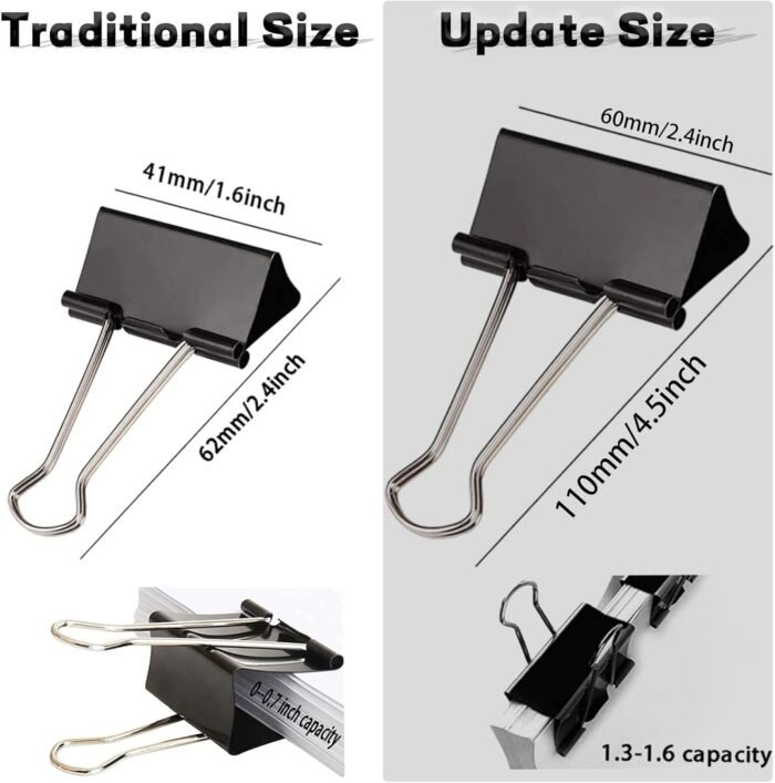 Upgrade Extra Large Size: Traditional large binder clips are 2″ length and 0.8″ capacity, but our UPGRADE EXTRA LARGE SIZE are 2.4″ length, 1.3″ capacity. There are 36 packs large binder clips meet your daily needs.